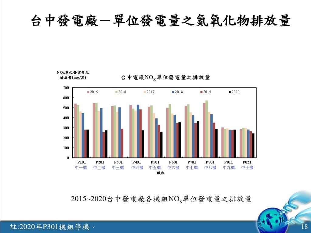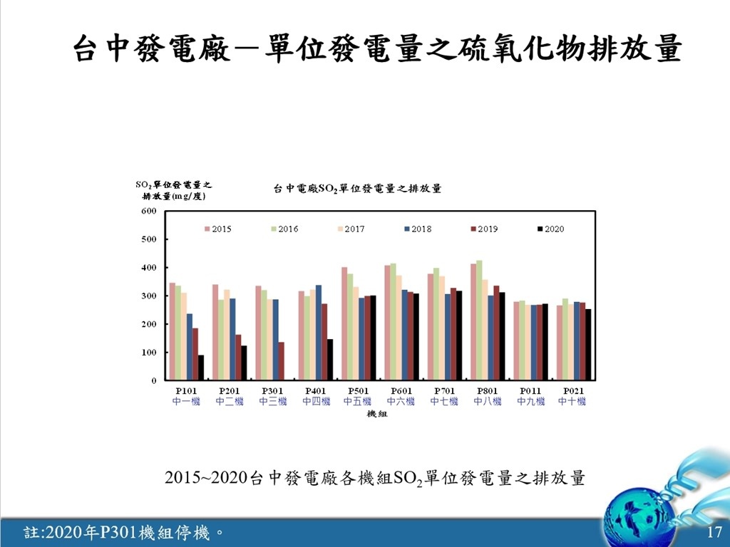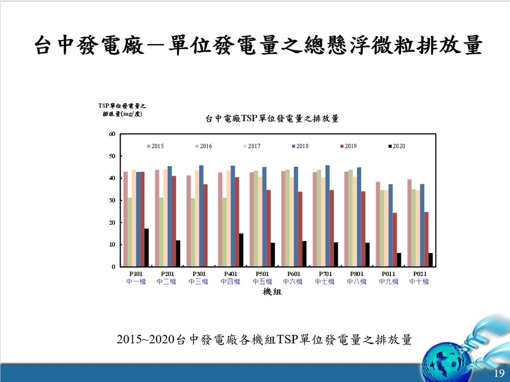 中一~四機是台中火力發電廠第一期建設的機組,在民國81年底前全部完成商轉,當然運轉期間也是最為久遠,機組運轉發電時排放之煙氣最不環保嗎?根據3/5在彰化縣自然生態教育中心(伸港鄉慶安路800號),舉行的台中火力發電廠環境空氣品質平行監測工作年度報告,會議中所發表的簡報裡針對各機組近六年單位發電量的汙染物排放量,分別截圖三張如下。