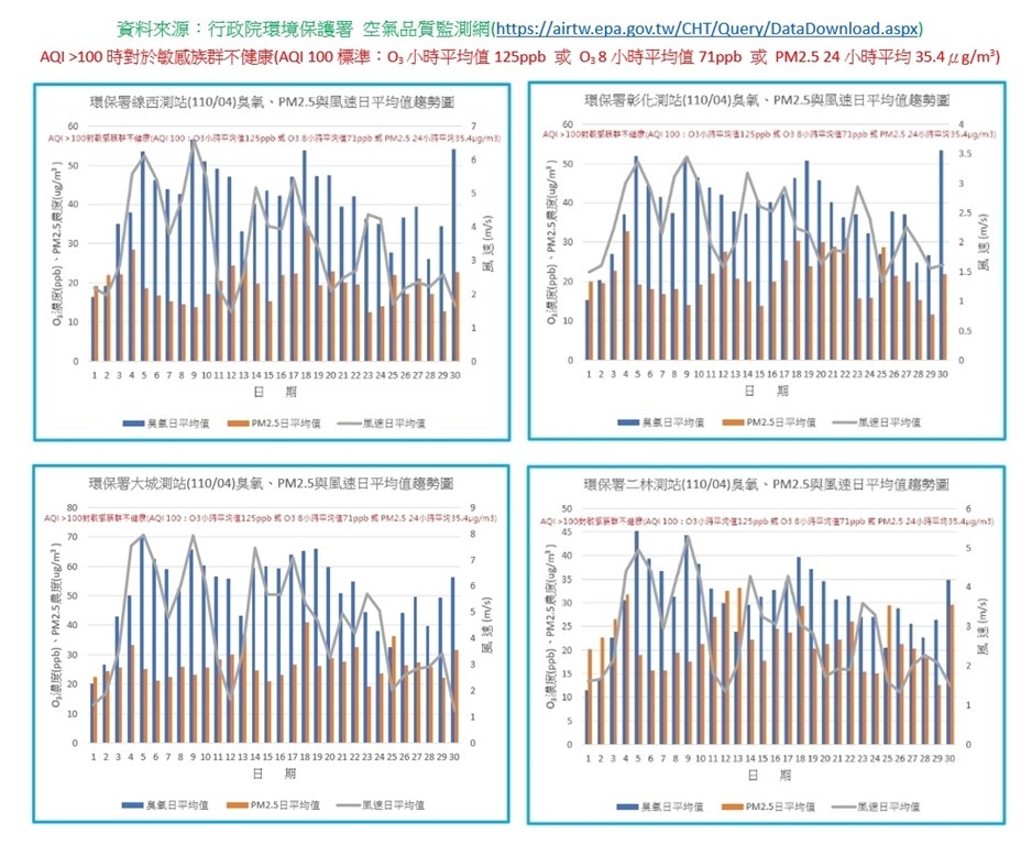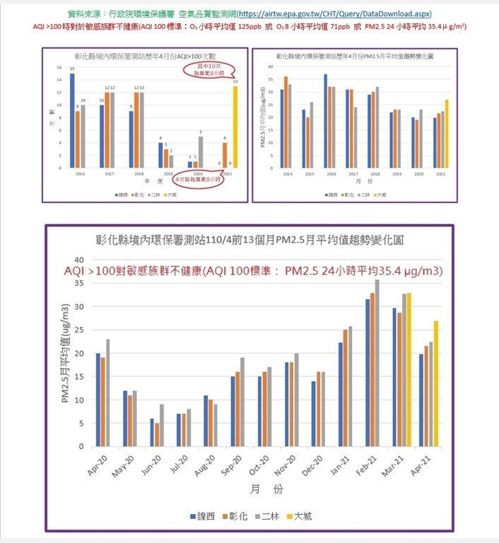 從環保署空氣品質監測網的資料下載做統計分析,最早期設置的彰化、線西與二林等3個監測站,整月PM2.5平均濃度大約在19.8~22.4μg/m3,大致上相差不遠。但是,從行動站改制為固定站的大城監測站,位處接近雲林麥寮六輕工業區,不僅PM2.5月平均濃度26.9μg/m3,因此有3天PM2.5達到對於敏感族群不健康AQI>100的等級,另外也有10天之多臭氧濃度,同樣達到對於敏感族群不健康AQI>100的等級;而比較內陸的彰化市因為人口較聚集,使用許多的機動車輛所連帶影響臭氧濃度升高,也出現4天AQI>100對於敏感族群不健康。